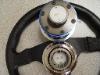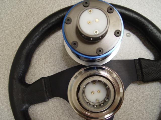 | Steering Wheel Quick Release Type -2 universal ball bearing quick release kit for any cars equipped with MOMO, SPARCO or NARDI hubs. Ball bearing swivel mechanism, slide the steering wheel onto the hub and swivel the steering wheel will lock itself into place the same position you took the steering wheel off (goes on one way). Kit also act as a 2 1/2inches spacer by pulling the steering wheel towards the driver, comes with wires to hook up horn button with the grounding plates from the existing steering wheel hub. In addition, the kit act as anti-theft mechanism where most thefts will be discouraged in stealing the car without a steering wheel! $100 |
